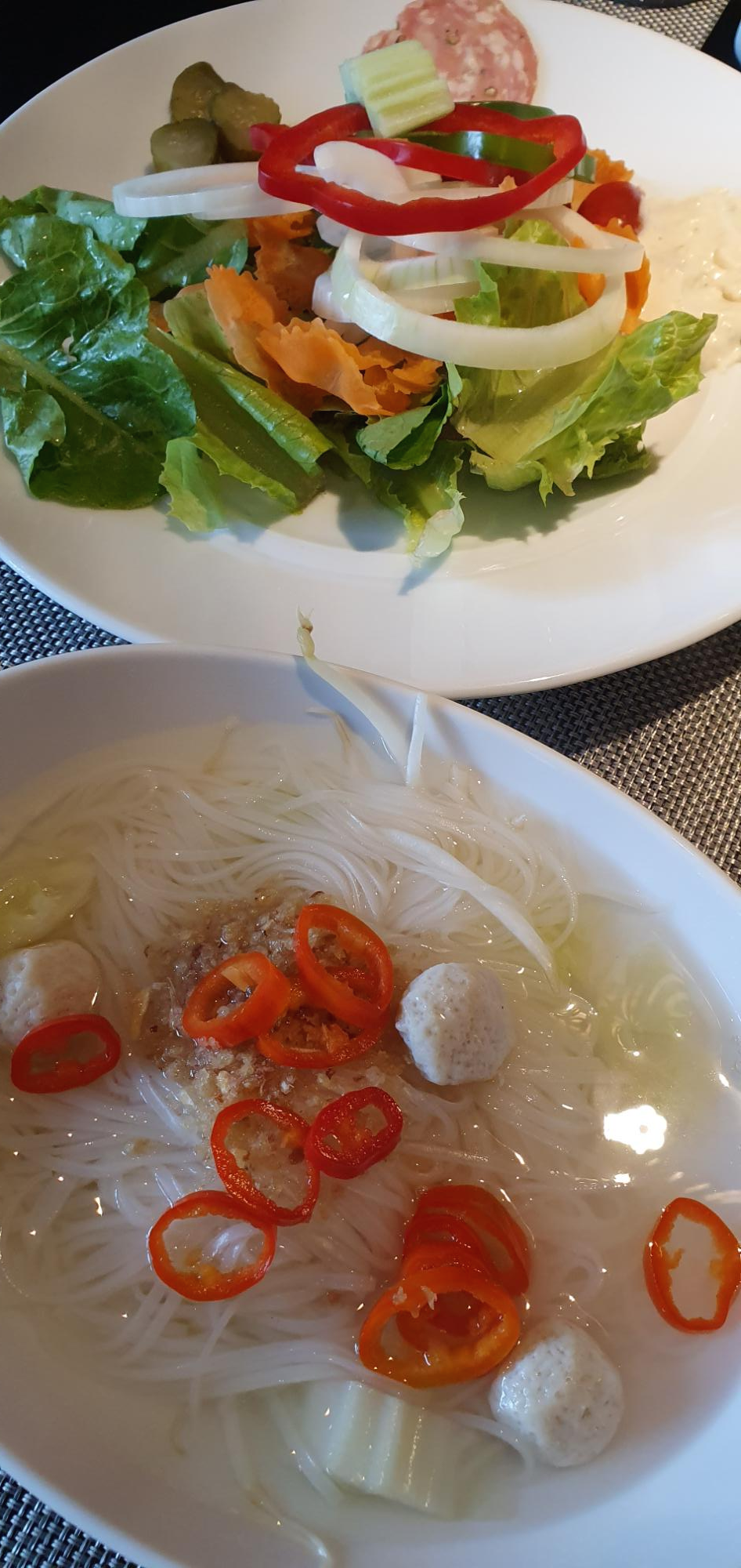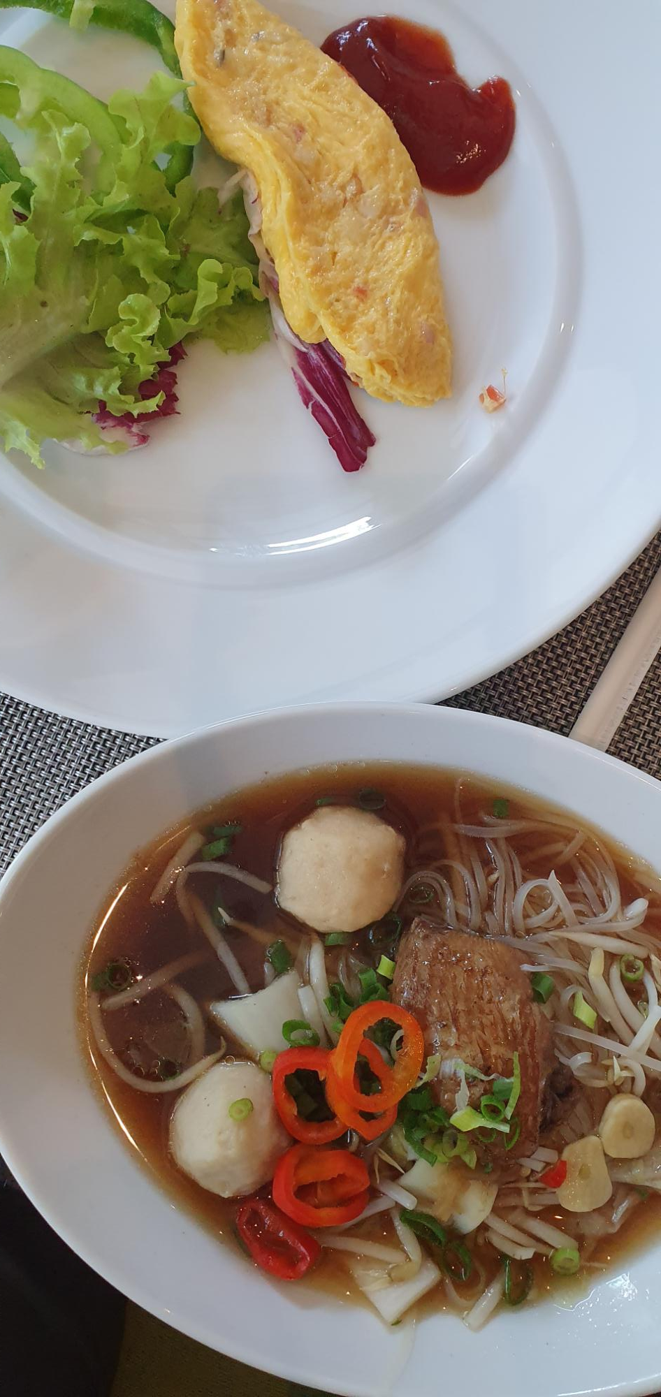 다음 날 조식. (첫 국수와 두 번째 국수의 닭 날개 갯수가 틀림)