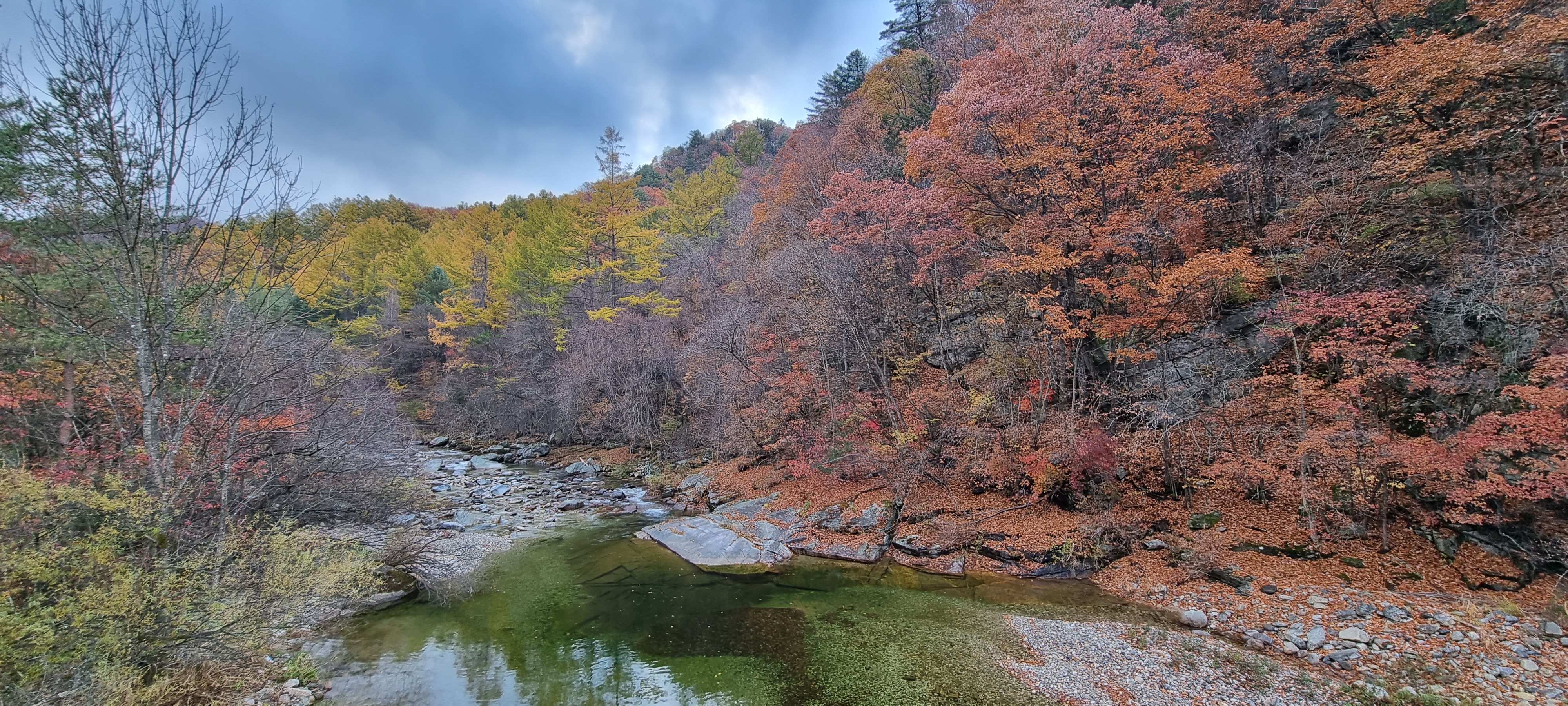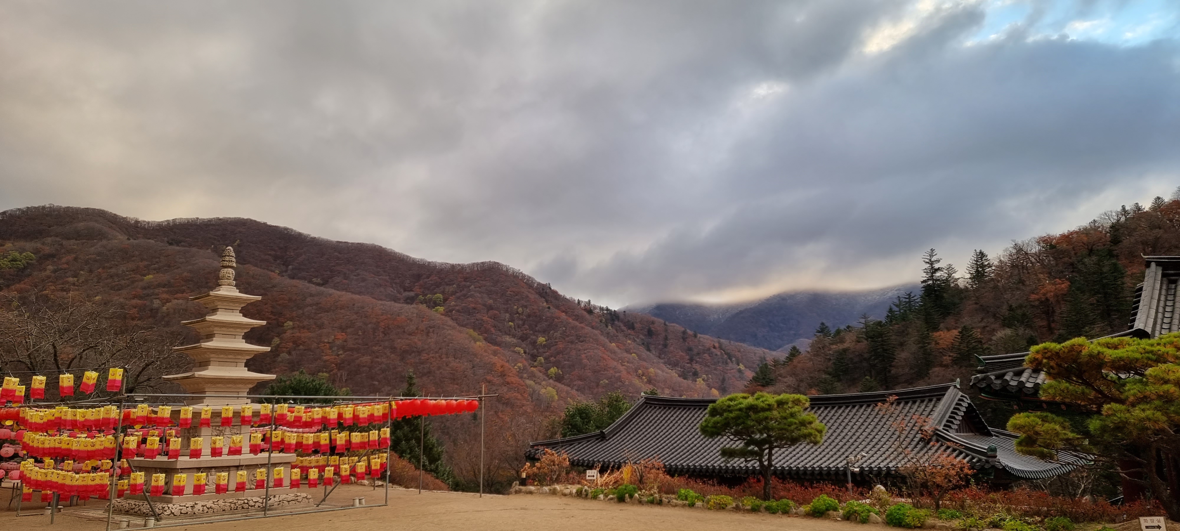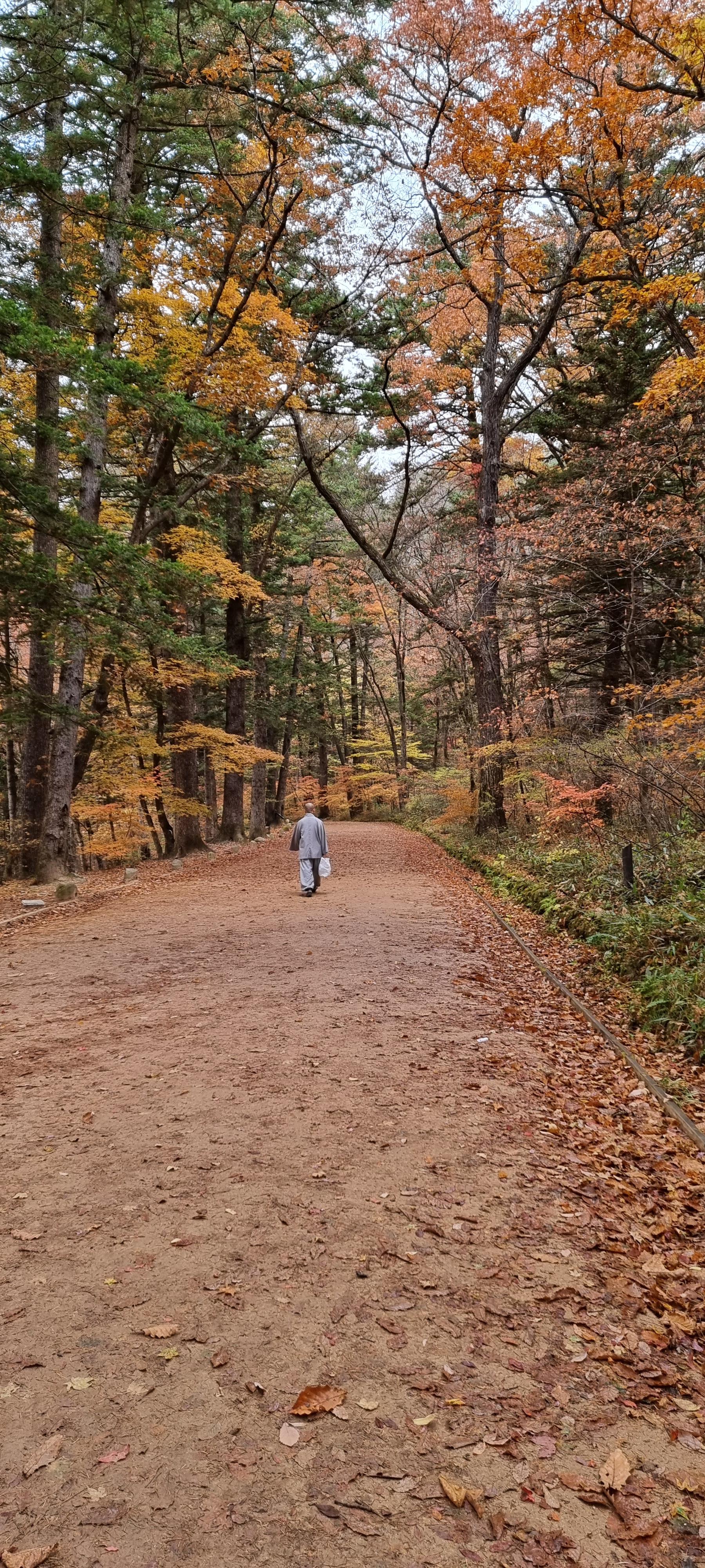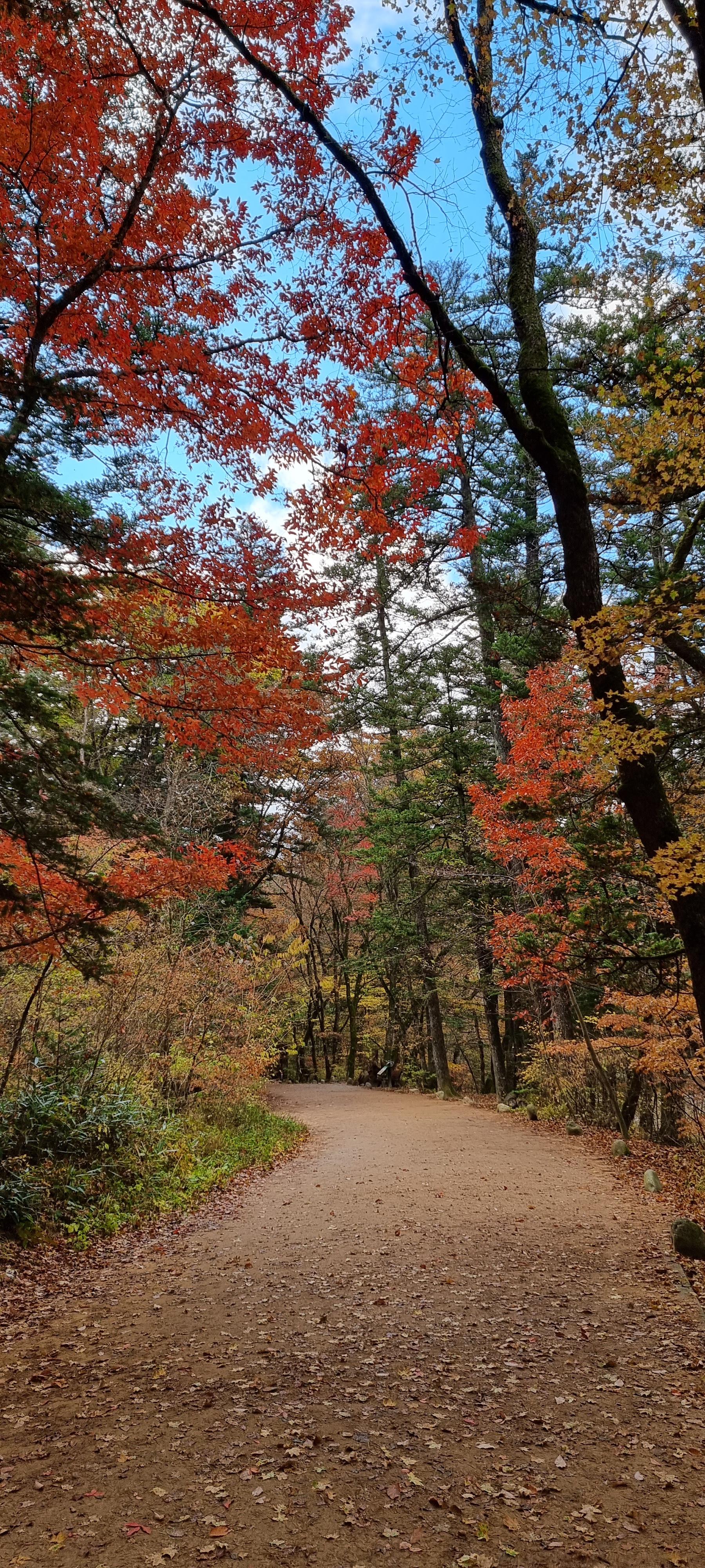 30분 뒤 막바지 단풍 즐기려는 사람들이 관광버스에서 쏟아져 내림.