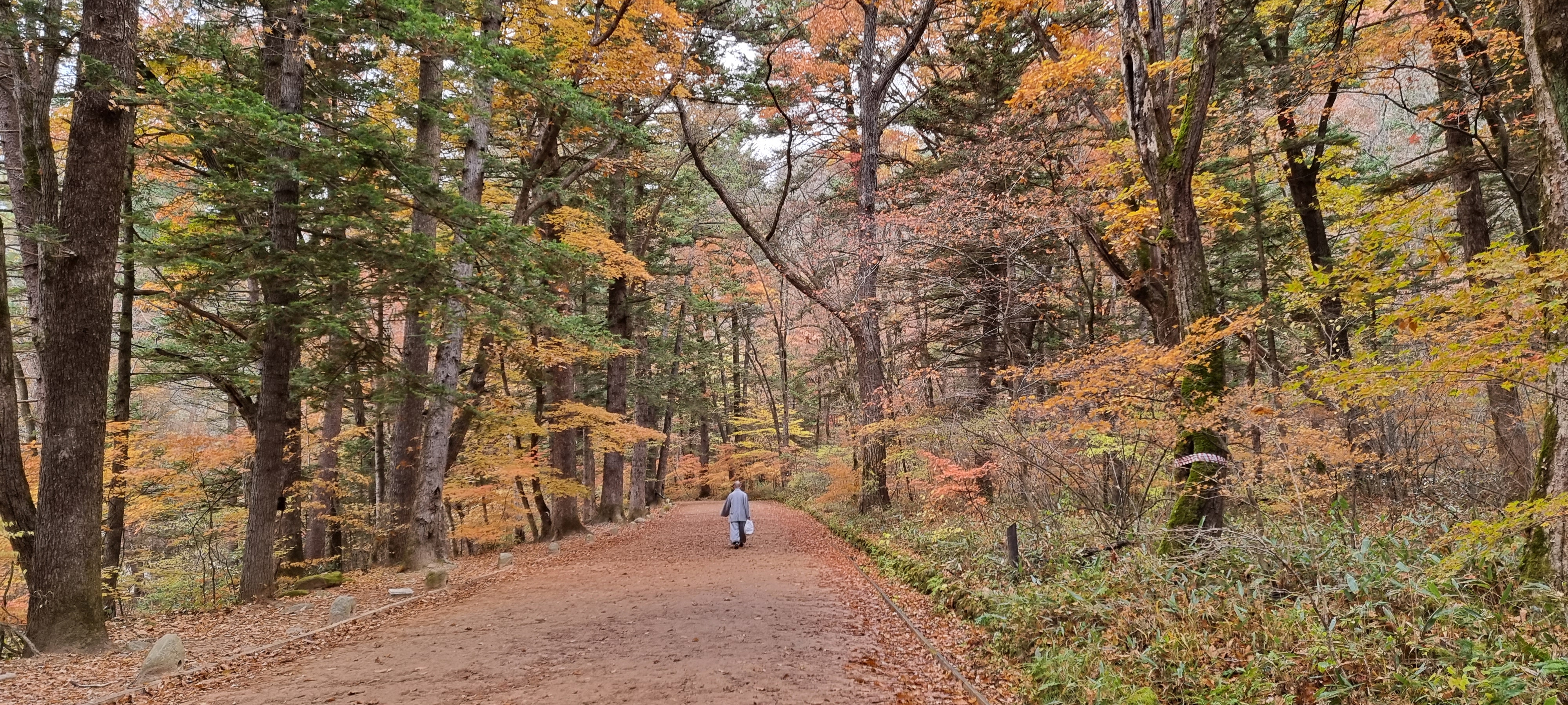 30분 뒤 막바지 단풍 즐기려는 사람들이 관광버스에서 쏟아져 내림.