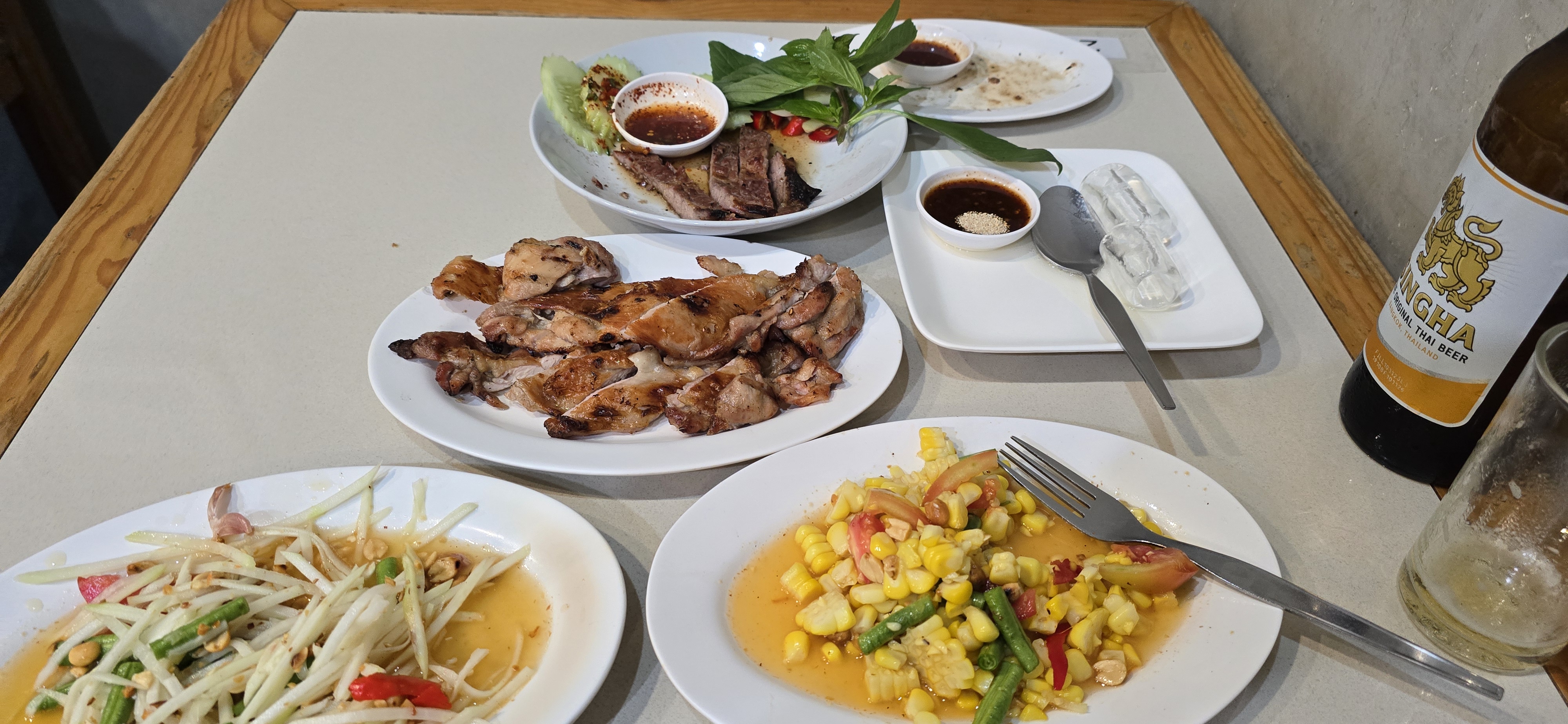 옆 테이블 두 명이 달랑 닭구이와 옥수수 쏨땀을 시켜 먹어서 뻘쭘함.